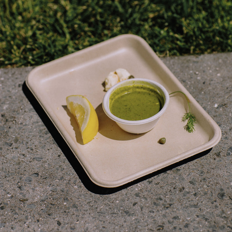 Separate your sauce. Our sugarcane sauce containers are made of sugarcane pulp, a 100% renewable resource and alternative to petrochemical plastics. They are certified for home and commercial composting. Custom-designed lids provide a secure fit, making these containers ideal for takeaway sauces, mayo, and anything really that your customers would want on the side. Available in 60ml and 120ml. The price includes a sauce container and lid.