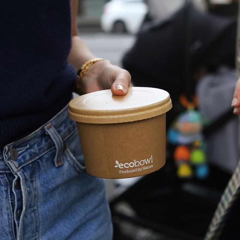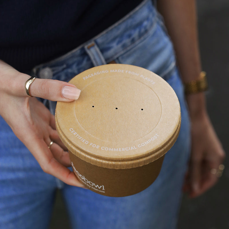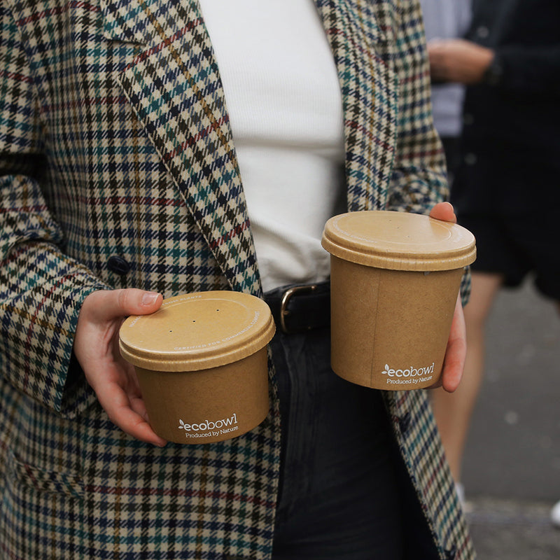 Ecoware kraft paper lids offer a secure, leak-proof fit for our EcoBowl range. Lined with polylactic acid (PLA), the Ingeo™ brand, unlike PE linings manufactured from petrochemicals, PLA is produced from plant feedstocks such as corn, cassava, sugar cane or beets, providing insulation, water and oil resistance. Suitable for hot and cold use and ideal for soups and dressed salads, these paper bowls provide an alternative to plastic containers, fulfilling all criteria for products used in the food service industry.